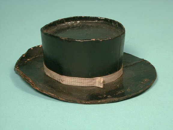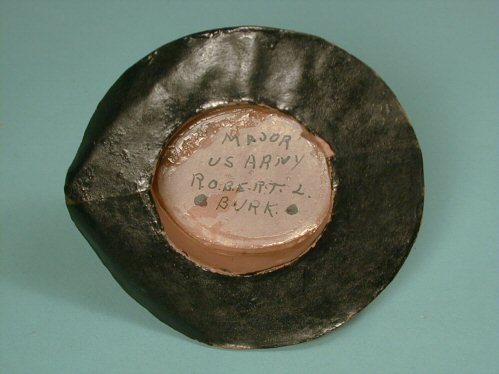 This papier mache Civil War era Army hat is one of the best early items I've ever had. Made c. 1862-65, it is a truely fantastic collector's item for those who collect military, early miniatures or early hats. Both sides are shown in the photos and also the inside. The hat is black with a white ribbon at the brim and has a very early patina. Written with a quill pen in early ink is hand written on the inside: Major US Army Robert L. Burk. On the ribbon on the brim is written U.S. Army. This miniature U.S. Army Major's military hat can be displayed on its own or with a doll. The condition is wonderful especially considering the age of this hat with just minor paint rubs. Opening for the head is 2" diameter. The brim from front to back is 4 3/8". and height is 1 3/4". Front of brim is slighty curled up just like the real hats. These wonderful early miniatures from the mid-1800's Civil War era are just so difficult to find; fantastic piece of Americana and a rare item for the advanced collector.