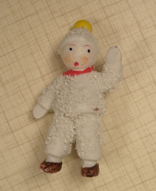 Very unusual German snow baby with hat and large yellow pom pom. He has an 0 shaped mouth, round face with a raised nose. Red collar. One hand is raised and the other is down. 2 3/4" high. Nice condition with no breaks or repairs. Some grout missing as shown in the photos. Needs a little sticky wax to stand.