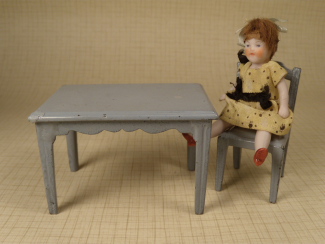 A matching set of Kilgore dollhouse kitchen table and chair enameled in a lovely soft dove gray which can be utilized either for a 1" scale nursery as pictured with a 1" scale child doll (doll not for sale). Or it can be used in a 3/4" scale room in a dollhouse as full size furniture. Very nice condition with very minimal wear on the paint. These were made in the 1920's and 1930's in the USA. Marked only with numbers on the bottom. Table: 2 1/8" high, 3 1/8" long, 2 1/8" deep. Chair: 2 3/8" high at highest point.