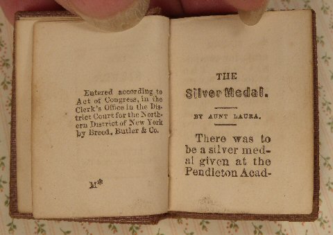 Beautiful leather bound book, cover is embossed with some gold gilt decoration and edges of pages gold gilt. The Silver Medal was written by Aunt Laura whose name was Frances Elizabeth Barrow and published by Breed, Butler & Co., in Buffalo in 1863, as written on the title page. The complete book has 64 pages and tells a story of a young girl and how she desired to win a Silver Medal award. Very nice condition. Size is 1 3/16" wide by 1 5/8" high. These early miniature books are so difficult to find. Perfect for the early dollhouse.