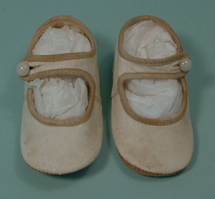 Shown is a pair of white leather shoes with glass button fasteners, suitable for a larger size doll. Length is 4" and width at widest point is 1 3/4". These were produced c.1900. These are in nice condition showing very minor wear.