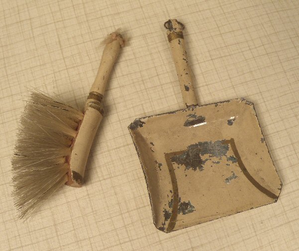 This very early matching dust pan and brush is great for a larger scale kitchen, or room box or as an accessory for a doll. Made in Germany, c. 1880-90 period. The pan is tin and the brush is wood with natural bristles and both are enameled in a cream color with gold trim. There is some paint loss, mostly on the pan with the brush being in very good shape. These very early accessories are getting harder and harder to find. The length of the brush is 3" on the wood portion and the length of the pan is 3 7/8" and width is 2 1/4".