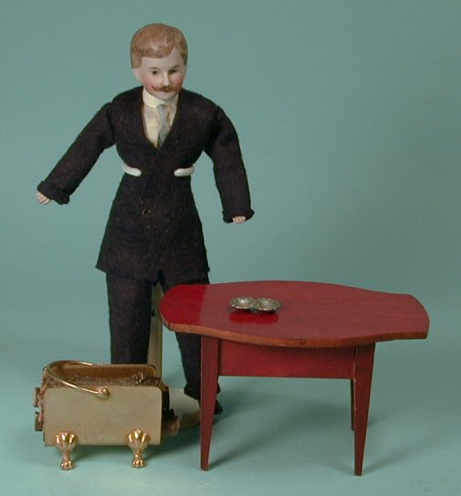 This is the old way that salt and pepper used to be put on the table. The holder has two parts, one for salt and the other for pepper and diners would pinch the condiment to sprinkle on their food. Decorated with a scallop design on the edges. Made in Germany during the early 1900's by the firm of Gerlach from soft metal. This is a very rare piece. Overall length is 3/4" and pictured in a 1" scale setting with early German dollhouse man and table, which are sold separately. Very nice condition.