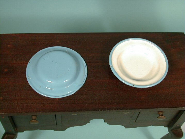 This set of matching granite ware plates are being sold as a set. They exhibit a lovely color combination of white interior with light blue edging which continues on the reverse side--front and back are pictured. The set is also shown in a setting of a china doll and early Loring Cushing sideboard (other items are being sold separately) for size comparison. Each plate is 2 3/4" diameter. Very nice condition with minor wear. No markings but made in Germany c. 1915.