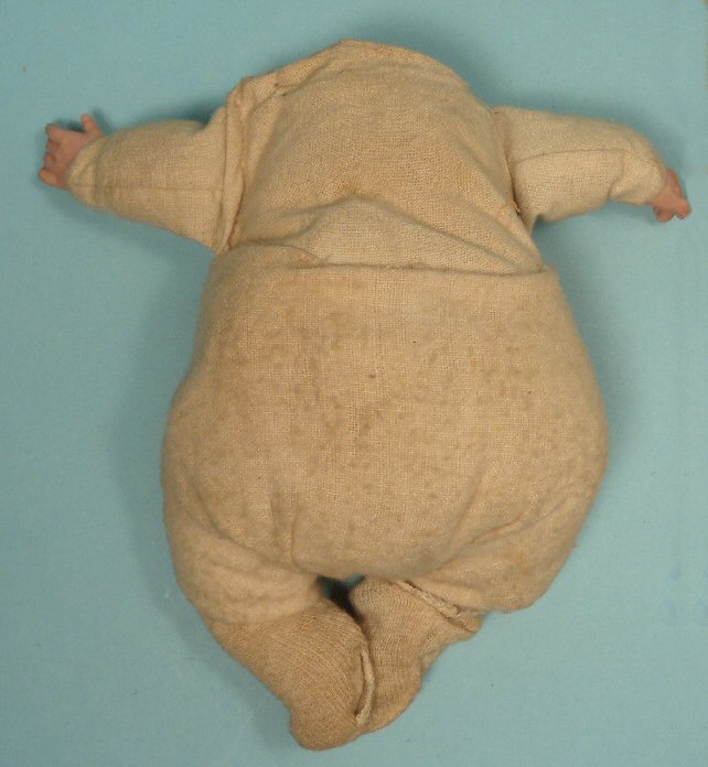Very rare small size cloth original Bye Lo body with original celluloid hands in perfect condtion. The front of the body is marked with the typical purplish marking, but is faded, Bye Lo is extremely faint but there...what can be clearly made out are the words: Grace Storey. For Grace Storey Putnam. This small size is so rare and hard to find. From the tip of the toe to the top of the neck is 6" high. My estimate would be that this body would make a 7 to 7/12" high Bye Lo doll. This rare body also comes with the original diaper and socks, which I have not removed because I think they have never been off the body. From the early 1920's. This very small cloth body was made for the German bisque headed Bye Lo baby and is in very nice condition, shows typical aging.