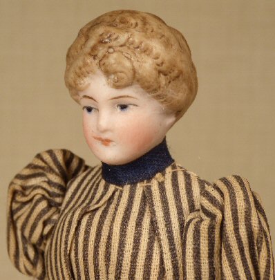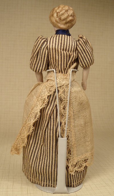 What a splendid mother figure for the Victorian dollhouse. She was made by the German firm of Kestner c. 1895, wearing her all original factory-made clothing of striped dress with laced apron and high neckline and poofed sleaves. She has molded light brown hair with curls coming down over her forhead. Delicately painted face with a faint smile, as if she is thinking, "All's well with the dollhouse." She is 6 1/2" tall, bisque head, arms and legs with 2-strap molded black shoes and white stockings. All original slip and drawers underneath. She is in beautiful condition, with no breaks or repairs. These all-original dollhouse occupants are getting harder and harder to find.