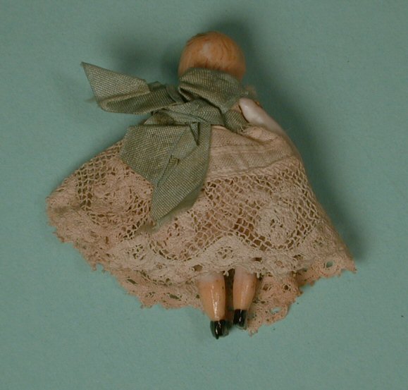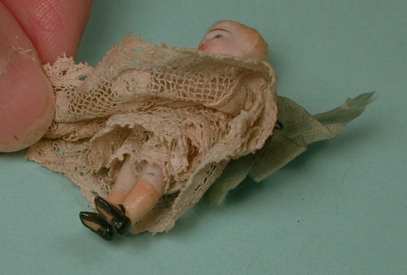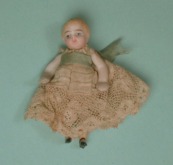 Fantastic dollhouse toddler or baby made by the German firm of Simon & Halbig. She is very early c. 1885 and instead of the common wire or elastic jointing that most all bisque dolls have, this little gem is peg jointed at the shoulders and hips, a sign of an early, high quality all bisque doll. She is 2" high, and in perfect porportion for a baby or toddler with short blond molded hair and very delicately painted facial features, extremely well done, especially considering the tiny size of this little girl. But what is really amazing, and something I have not come across in such a small doll is that she has yellow stockings with the tiniest molded Maryjane, one-strap black shoes, the soles of which are beige. Her original darling little dress is all original with lots of lace and original aqua color ribbon at the waiste and tied in the back with a bow. Underneath is her original lace slip and panties as shown in the photo of the close-up of her yellow stockings and shoes. Excellent condition with no breaks or repairs. Beautifully modeled head, arms and legs just as expected from Simon & Halbig. Perfect 1" scale. Her clothing has never been removed and even the bow in the back is originally tied. This little girl is a gem.
