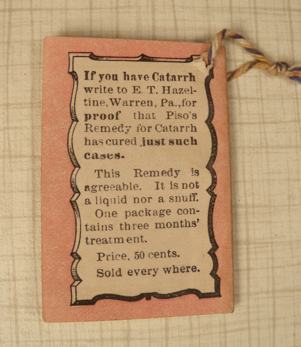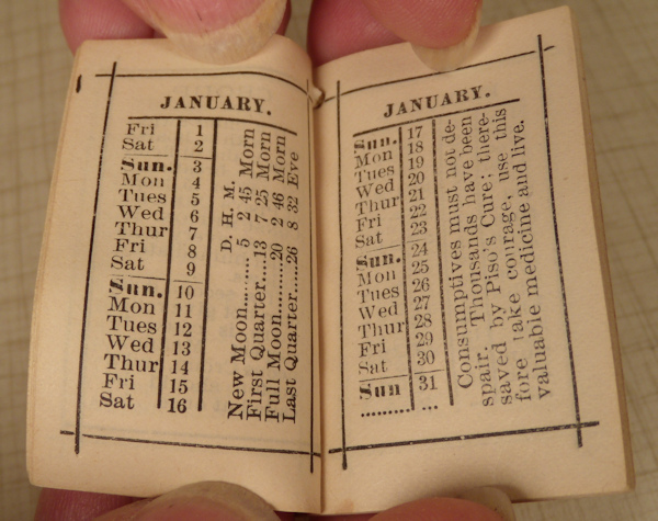 This original 1886 almanac is the perfect size for an antique doll lady or child. This little booklet is entitled: Hazeltine's Pocketbook Almanac for 1886. It is in marvelous condition and is one of those rare accessories that is so hard to find. Not only is it a calendar from January to December, but every page touts Piso's miracle remedy for everything from coughs, headaches, colds to consumption! Pictured are the front and back covers and 2 pages of the interior. 34 pages. Printed in "Warren, Pa, 1886". Great condition. Still has its original stringing for attaching to a doll's hand. 1 3/8" wide x 2" high.