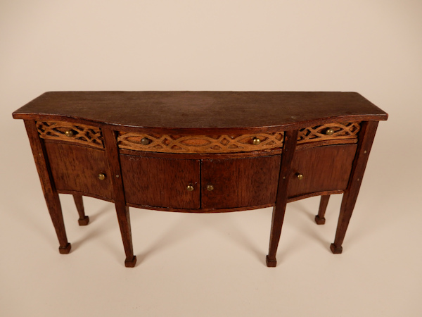 This majestic Duncan Phyfe sideboard is one of the most beautiful, all mahogany pieces made by the Lynnfield makers c. 1940. Lovely curvatures, including the 4 doors, 2 of which are convex and 2 are concave. Lovely dark mahogany finish. This attractive sideboard is one of their harder to find pieces as it was made for just a few years. 1" scale, 3 1/2" high, 6" long, 2" deep. Lovely condition with no breaks or repairs.