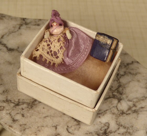 Tiny, all original German peg-wooden doll with painted features, jointed at the neck and legs and wearing her original lavender color silk dress and matching hat and lace apron. She is approximately a tiny 3/4" high. Accompanying her is a dark blue leather book with a tiny wire clasp, with many tiny pages with hand written writing inside, but the writing is too small for me to read, even with a magnifying glass. The cover has a title: Recessional and the next word I cannot make out...it is that tiny. Both are within a tiny old box with imprinted writing: Wilh. Schwarz, Elfenbeinschnitzer, Interlaken. The doll and tiny book sit inside the box on top of very old cotton wool. This grouping came out of an estate in Maine. Rare and so unusual. c. 1885-90 period. The box is 1 1/8" x 1 1/4". All in lovely condition. Perfect as a toy for a dollhouse child; also pictured on top of a marble-top early Germany dollhouse table for size comparison.