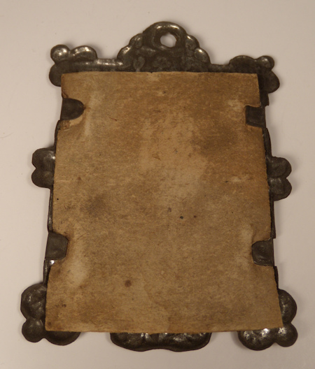 Very early dollhouse accessory, c. 1860 and possibly even earlier. The mirror has a beautifully embossed tin frame enameled in a dark gray color. There are swirls and scrolls all over with a hole at the top ready to hang in the early dollhouse. The reverse is also pictured to show how early this item is with its original card backing. Lovely condition. Because of the angle in the photography, the mirror portion looks to be dark---it is not, the mirror part is in good condition. 3 3/4" high at the highest point and 2 5/8" wide. at the widest point. These types of very early dollhouse accessories are getting to be more and more difficult to find.