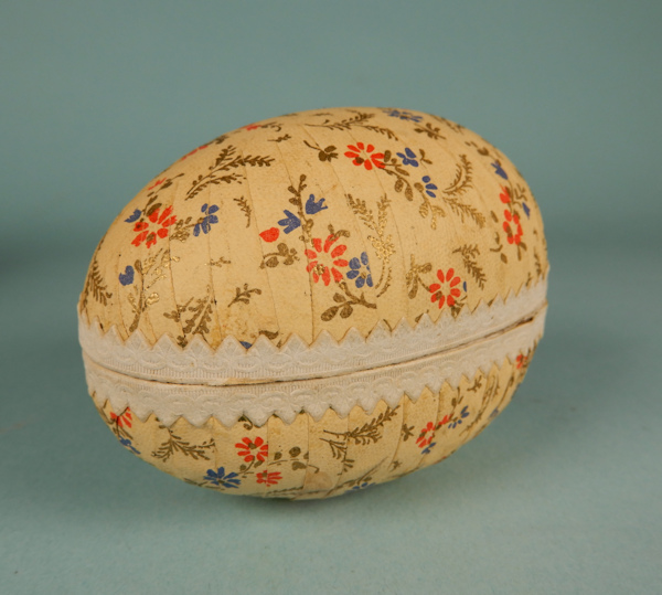 Beautifully made papier mache goose covered with a lovely imprinted paper of red and blue flowers with gold leaves and vines. The interior is another imprinted paper pattern of dark pink flowers, leaves and vines. The edges of the egg has white embossed Dresden paper on the outside and the inside of the bottom piece also has lovely embossed white paper in a point design. Also has a string loop. This held candy at one time. It is the size of a goose egg 2 1/2" high, and 3 1/8" long. Marked "Made in Germany." Lovely overall condition. Tiny bit of wear on the bottom where it touches the surface of where it is placed. This is a lovely piece, especially at Easter time for decorating. Also pictured with two wooden chickens (which are sold separately under Antique Dollhouse Miniatures and Accessories).