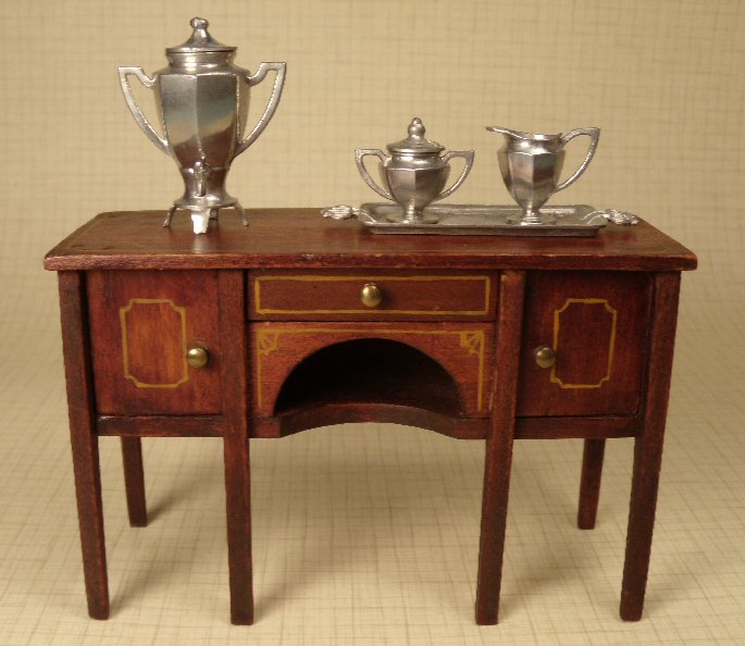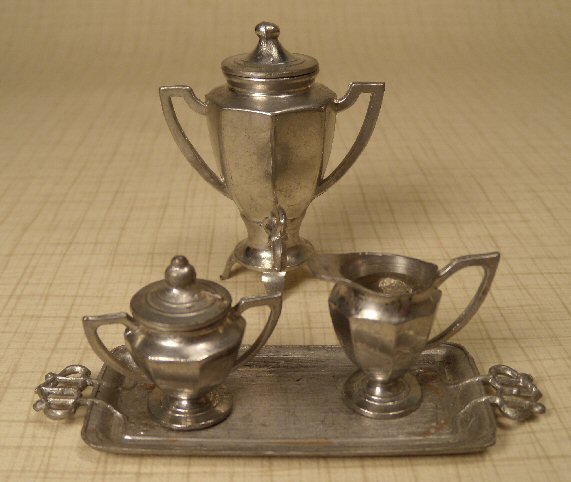 This is one of the rarest sets I have ever had made by the German firm of Gerlach and sold in the Tynietoy catalogs as one of their accessories. It contains a lovely samovar with cover with matching sugar with cover and creamer--note the same angles on the body of the pieces and the handles. All are pictured on a Tynietoy wooden buffet to show how lovely they look (buffet sold separately). Samovars are very difficult to find and to have the matching sugar and creamer is an extra bonus. All in beautiful condition. Samovar is 1 7/8" high.