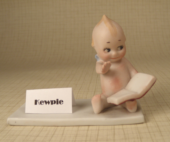 This rare little Kewpie is reading a book and sitting on a placecard holder. He is 2 1/4" tall and 2 7/8" long. He is stamped with a C in a circle and "77" underneath. This is great quality bisque in excellent condition with no breaks or repairs. He was made in Germany, c. 1915, and designed by Rose O'Neill, one of America's most admired artists working during the first portion of the 1900's. Her adorable Kewpies are still as loved today as they were then.