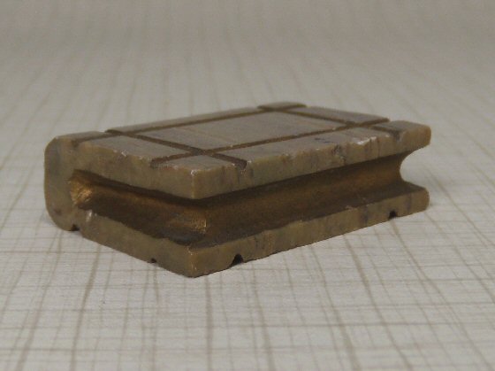 Pictured is a miniature stone book, what I would call doll size. The stone is light brown with natural speckling and lines running through it. It is 1 1/2" long by 1 1/8" wide. The stone has carved lines and the sides are carved out to form "pages"....the lines and pages are enameled with gold. Of course, this is a faux book. Beautifully made and very hard to find. I believe it could be serpentine stone and it is very cold to the touch. Nice condition with a few minor nicks.