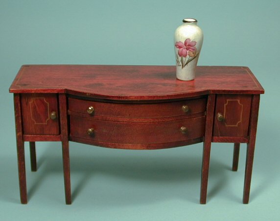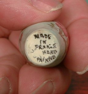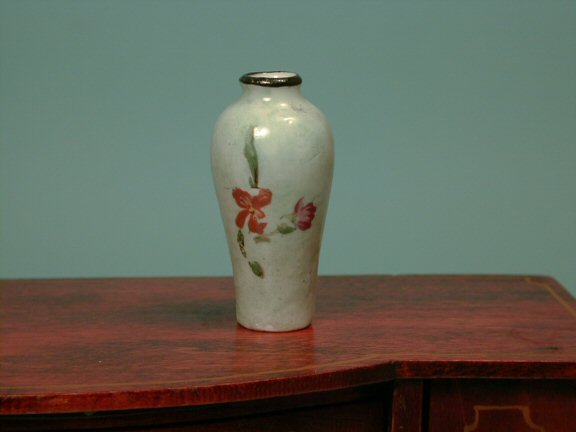 This is a lovely miniature hand-made and painted vase from c. 1900-10 period. Two different groupings of flowers are hand painted on front and back, both of which are shown. Marked: Made in France, Hand Painted. Pictured with a Tynietoy (not for sale) buffet for size comparison. 1 3/4" high. From a large collection of miniature early vases.