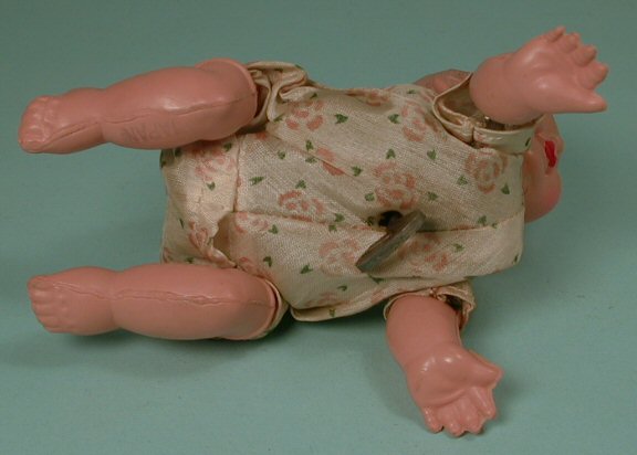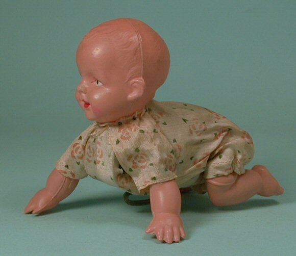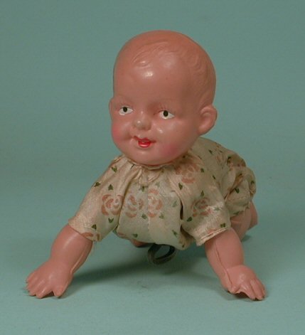Darling little baby, in his original romper, which can be wound up and he crawls forward. In excellent working order and all original. He has a sweet face with a smiling expression. Head, arms and legs are celluloid and his little romper is silk with a nice floral pattern. He was made in Japan, 1940's. One of his legs is lightly embossed underneath, Made in Occupied Japan. Overall length is 5", height is 4 1/4". Very nice condition with no breaks or repairs.