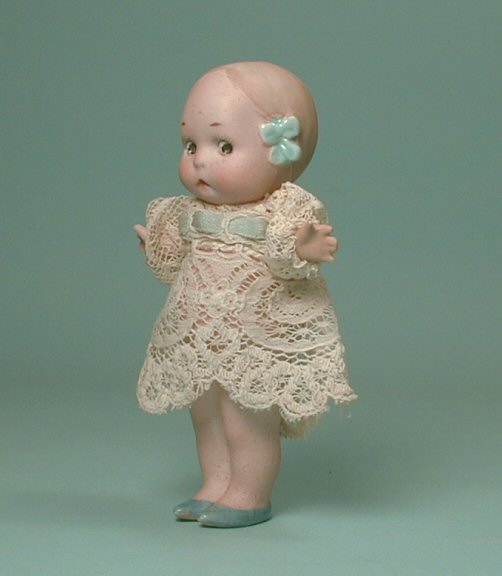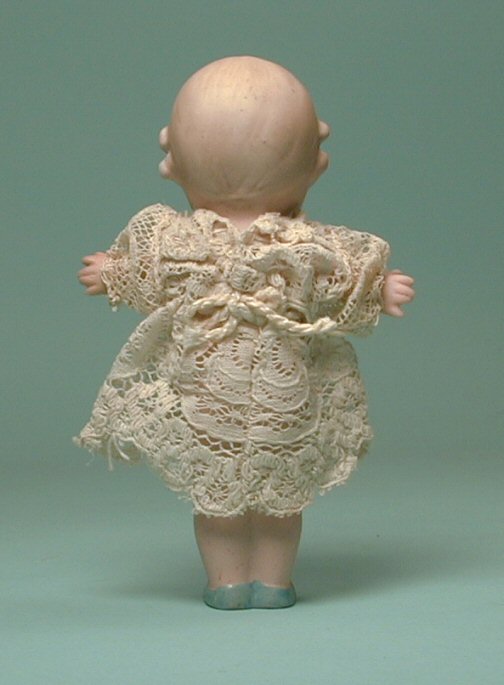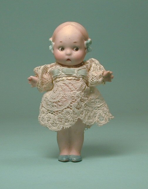 What a sweet, pouty all bisque girl made by Gbr. Heubach c. 1910-15 era. Look at that expression!! She has intaglio googlie eyes with a downturned open/closed mouth as if she was suddenly surprised by something. Fantastic molded blue bows that are glazed by her ears with matching blue shoes. Her excellent antique lace dress has the same blue silk ribbon decorating the front. She is 4 1/2" high. Finely made and well balanced so she can stand on her own. Arms are jointed and her legs are stationary. This is a rare, and hard to find Heubach character. Great condition with no breaks or hairlines. This same model can be see on page 108 in Richter & Schmelcher's book, Heubach Character Dolls & Figurines.