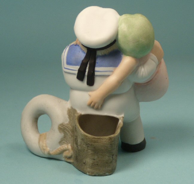 Just look at that sailor's face--what a naughtly look he has!! This great sailor with long beard and with quite a look has just hoisted the amply shaped bathing beauty, snuggling close. Perhaps he is saving her from floundering in the water....but she doesn't seem to mind! No need for that life preserver! Super great modeling on this porcelain piece made by the German firm of Schafer & Vater. She has quite the buxom shape and ample derriere, with her pink bathing outfit and green bathing cap. Marked with the Schafer & Vater logo and a partial Made in Germany on the bottom. The back portion is actually a container. Fantastic piece. Great condition with no breaks or repairs. Height is 4" and width at widest point is 3 3/4". These funny early pieces are getting harder and harder to find.