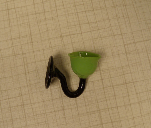 Great looking glass scounce, black base and arm, with a wonderful green glass shade, all one piece. German made blown glass, from the famous glass blowing Lauscha area. c.1910-20. Wonderful condition. 1" high, 1" wide. Needs a little sticky wax to attach to wall. Would make a stunning addition to an early dollhouse or a Tynietoy dollhouse.