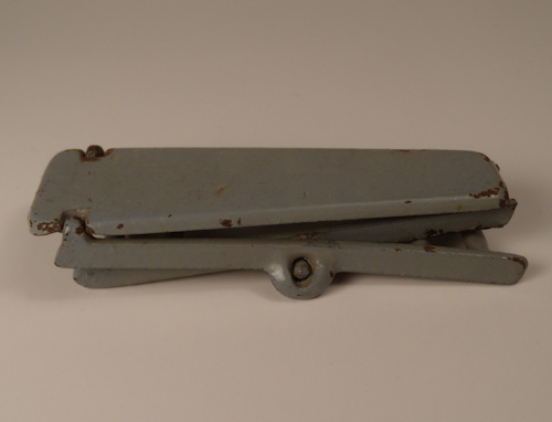 Very nicely made cast iron ironing board enameled in a dove gray, in 3/4" scale. It folds down flat as shown in the photo. It is incised on the bottom, Kilgore. Nice condition with no breaks, there is a bit of wear on the paint, mostly at the corners. Lenght: 3 1/4". Height: 2 1/8". Can be positioned in 3 different heights, 2 1/8" being the tallest. Made in U.S., 1920's.