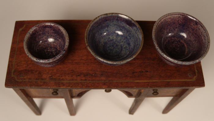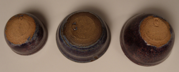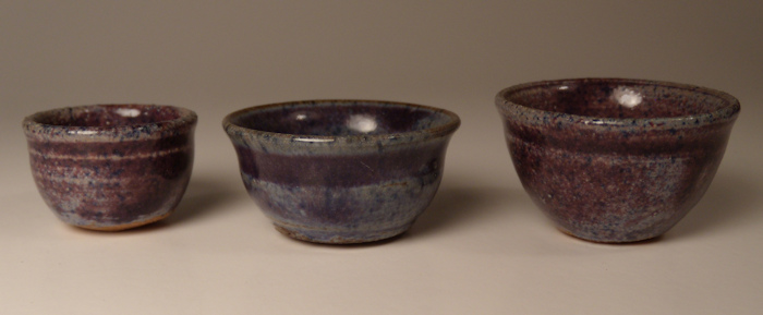 Splendid set of glazed redware nesting bowls all 3 marked with the capital letter G underneath. A unique mottled color application with sponge and brush affect in lovely shades of blues and purples with faint linework applied on the exteriors. The underneath portions are pictured showing the G marking on each and the unglazed redware. The striking color scheme in this set is absolutely lovely and each one is slightly different but all the combination of the same colors. The smallest bowl is 5/8" high, the middles sized bowl is 3/4" high and the largest bowl is 7/8" high. All in excellent condition. The numerous photos show different sides of each bowl. The last photo pictures a group of redware for size comparison and please note these nesting bowls inside each other. Also pictured on Tynietoy buffet and sideboard.