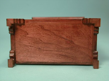 What a fabulous piece made by Roger Gutheil. The splendid bracket feetl are very delicately formed. The doors are raised paneled and when the door is open, one can see it has been made from numerous pieces. The top, which is pictured, is made from 4 separate pieces and bevels downwards. The interior has two bottom drawers with brass pull handles with brass escutcheons and brass hinges. There is also a high shelf and wooden pegs to hang clothes. Made from cherry wood and finished in a velvety smooth finish. Brass key holes and it even has a tiny brass key in one of the holes. This piece is so superb, it is hard to describe. 6 l/2" h., 4 3/8" w. 2 3/8" d. Marked on the bottom: R.L.Gutheil. Made c. 1980. Great condition with no breaks or repairs. The collection pictured here and in the following pictures were all purchased in 1979 and 1980 from Mr. Gutheil and were obtained from one collection.