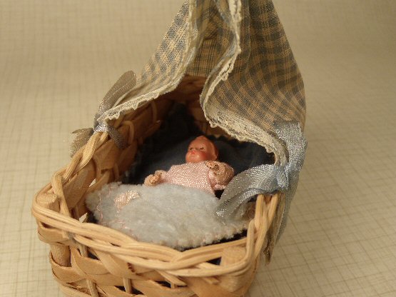What a darling ensemble consisting of a Caco baby laying in a wicker bed with original blue and white checked canopy decorated with lace and blue ribbons c. 1950. The original canopy is held on by metal wire. The inside mattress is a lovely deep blue velvet. The Caco baby has a sweet little face, with metal hands and metal blue painted baby shoes and she wears her original pink baby gown. Her original blue blanket is edged with pink thread and a pink ribbon to match and the blanket is stitched to the pink baby gown so that it is permanently attached. The wicker bed is wonderful and is very faintly marked West Germany on the bottom; I used a magnifying glass to see it. The baby is 2 1/8" long and in beautiful condition. 1" scale great for the mid-1900's dollhouse. Bed is 3 3/4" long and 5 1/4" high to the top of the canopy. Very minimal wear or aging.