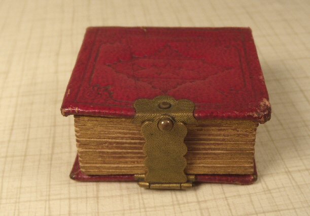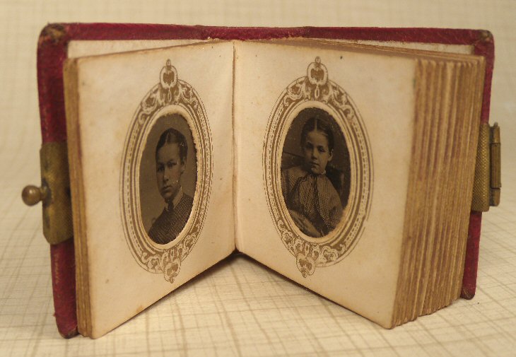 Lovely little photo album c. 1870, in beautiful red embossed leather with gold gilt embossing on the spine which reads: Album. Brass hinge which opens revealing babies, children, a mother and child, and adults. Altogether there are 24 pictures. Size is 1 5/8" wide, 1 3/4" long, 3/4" deep. Great condition with just minimal aging. Perfect for the fashion doll or another antique doll.