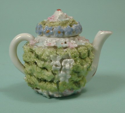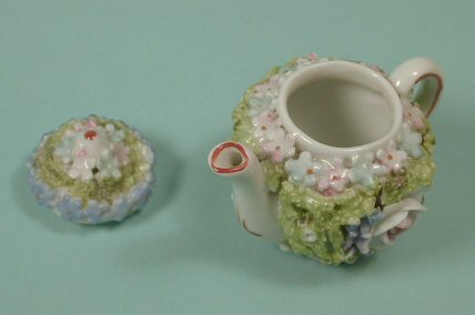 Great Elfinware teapot with cover. Has lots of moss going all the way around. Marked on the bottom "Germany." Made c. 1910-15 era. Spout and handle have red outlining. Very nice condition with just minor nicks on pedals. From my personal collection. Overall height is 2 1/2". This matches the sugar with cover offered separately.
