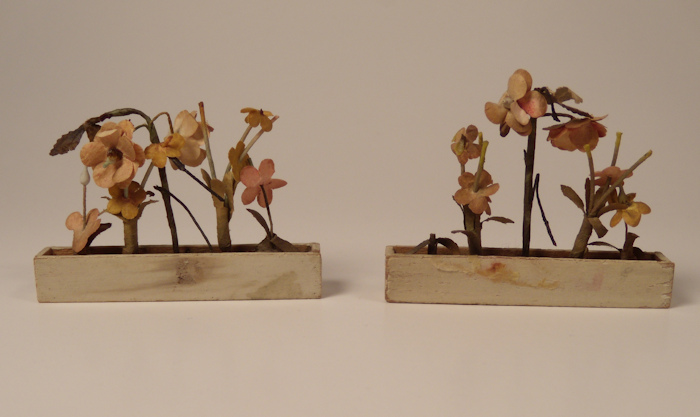Great matching flower boxes for a dollhouse or garden made most probably by Gottschalk in Germany c. 1910 era. They are stand alone and made this way and were not taken off of an existing dollhouse. Extremely hard to find. 1 inch scale. Each wooden box is 2 1/4" long by 5/16" deep. Overall height at highest point is 1 1/4". Flowers are fabric on green covered wire. Each box is marked Germany underneath as shown. Good condition, there is some wear on the flowers. The price includes both flower boxes.