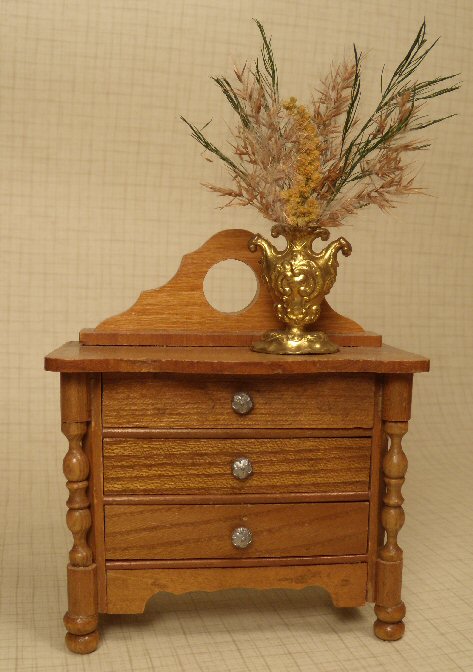 Fabulous ormolu vase made in Germany by Erhard and Sohne. The stunning gold gilt ormolu vase has two protruding side handles and beautifully impressed designs on the surface and wide round base. It has a lovely dried arrangement. Height of vase is 1 1/2" and overall height with arrangement is 3 1/4". Shown on a Schneegas dresser which is 4 1/2" high at the highest point of backsplash, for size comparison--dresser is sold separately. c. 1900. All in lovely condition.