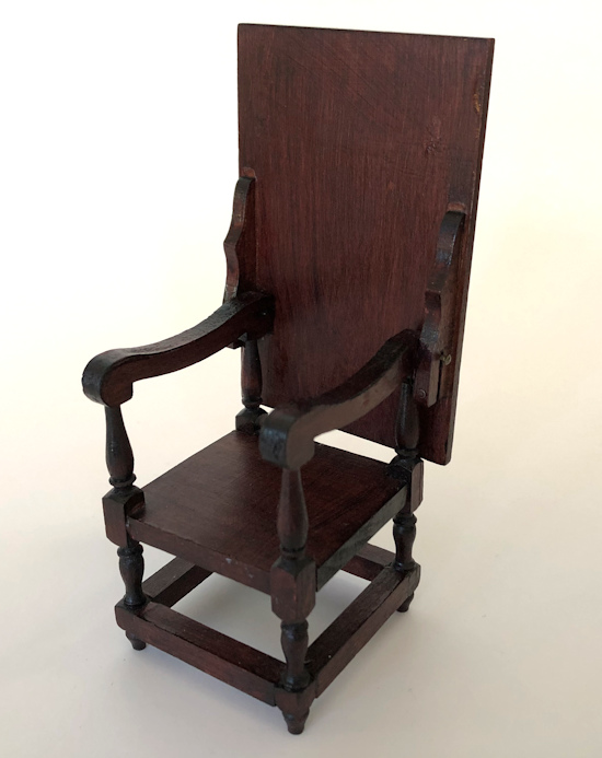Well made German cherry table which cleverly turns into an arm chair.c. 1900-10 period. All 4 legs are turned in a lovely design and when the top is folded up, it is a grand-looking arm chair fit for the master of the dollhouse. The dark cherry finish is very nice and smooth and well rubbed, with great patina. The top has beveled edges. Great condition with no breaks or repairs. Dimensions when in table position: 3 1/8" high and 3 5/8" long, 2 3/8" deep. Dimensions when in chair position: 2" wide, 2 3/8" deep, 5 1/4" high at the highest point. No markings, just a price in pencil.
