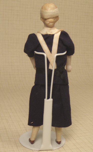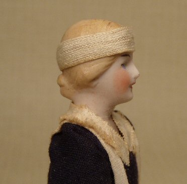 Fantastic dollhouse maid by the German firm of Kestner, c. 1920. Molded bisque shoulderhead, arms and legs; cloth body. She is 5" tall and has the most unusual face I have seen in a long time which can be viewed in the photos. The modeling is quite different and her face is delicately hand painted, with blue eyes. Her dark blond hair is pulled back into a low bun at the back and the sides are twisted to flair out a bit over the ears; there is also a center part which can be seen at the top of her head; one can even make out the separately molded hair strands. Just beautiful workmanship on the head of this doll. She wears her original factory clothing which consists of a simple navy blue uniform with white collar, small apron and shoulderstraps and a black ribbon belt around the waiste. She is in great condition with no breaks or repairs. A little bit of aging can be detected on the white portions of her uniform. This maid would look great in a doll house of early 1900 and also a Tynietoy dollhouse, as she is the correct era.