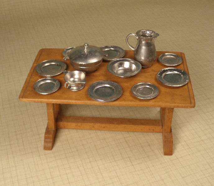 German metal water pitcher made by the Gerlach firm and sold through the Tynietoy catalog as one of their accessories. The pitcher is marked on the bottom: Germany. Height is 1 1/8". 1920's. Very nice condition. Pictured on a Tynietoy trestle table with other matching Gerlach pieces. Each is sold separately as listed; Tynietoy table is not for sale. Demonstration is for size comparison.