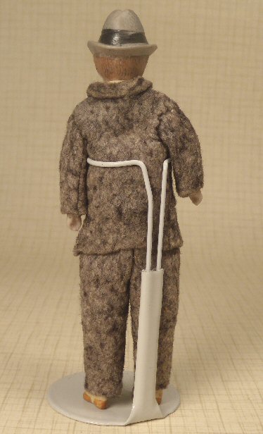 Great dollhouse gentleman with the rare feature of a molded bisque fedora hat on his head made by the Kestner firm in Germany c. 1915-20 era. The molded fedora is gray with a black painted band, which matches his gray/black mottled original felt suit which has Dresden paper buttons. He also wears his original white shirt and mustard yellow tie, which matches his very fancy yellow mustard molded bisque shoes and spats. He is 5" tall and is perfect for the slighly smaller than 1" scale dollhouse, similar to those made by Gottschalk, Schoenhut, Bliss and many others. He is also pictured with a German dining set (set sold separately) for size comparison and how handsome he looks in a setting. He is in great condition, all original, with no breaks or repairs. Dollhouse dolls with extras, like the molded hats, are getting harder and harder to find, especially in all original clothing.