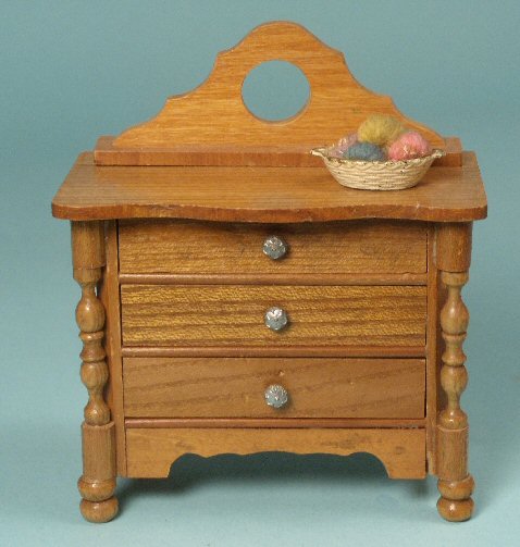 Very well made early metal basket enameled in white filled with numerous balls of real wool yarn in several different colors made by Dolly Dear, R. T. Kirland in Union Tennessee. The weaving on the basket is molded. Basket and balls of yarn are one inch scale and pictured on an early German dresser (dresser is sold separately) for size comparison. Nice condition--shows some aging and great early patina. c. 1930's era. Overall length of the basket including the side handles is 1 1/4".