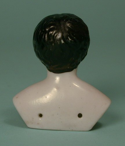 This is an extremely rare and very early china head boy. Surface is pink tinted, a rare feature, with rosy cheeks, short hair that is parted in the middle with well defined curls coming toward he forehead and much brush strokes in his black hair and his ears are exposed. Face is very well done with black and red lines above his blue eyes. Nose dots and lips are delicately painted. Inside marking is shown, very early fancy writing of 2/0. applied by hand in black. This is the first time I have ever had this particular model and it is very hard to find. Made in Germany c. 1870. Height is 2 1/4". Width from shoulder edge to shoulder edge is 1 15/16" just a smidge under 2". Excellent condition with no breaks, repairs or hairlines.