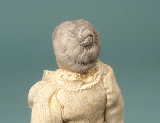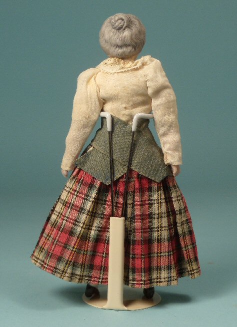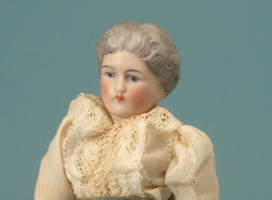 Fantastic dollhouse lady made by the firm of Kestner in Germany c. 1900 with a lovely gray hairstyle with lots of brush strokes to show hair strands and waves, pulled back with a fabulous bun in the back that shows braiding. This is one of the nicest hairstyles I have ever come across. Great execution on the face with much detailing and pursed lips. Head, arms and legs are bisque. Shoes are molded with small heels and light brown soles. Lovely antique outfit consisting of ruffled trimmed blouse and checked gathered skirt. Great character face and hair and one I have never had before. 6" tall. Clothing shows some aging.
