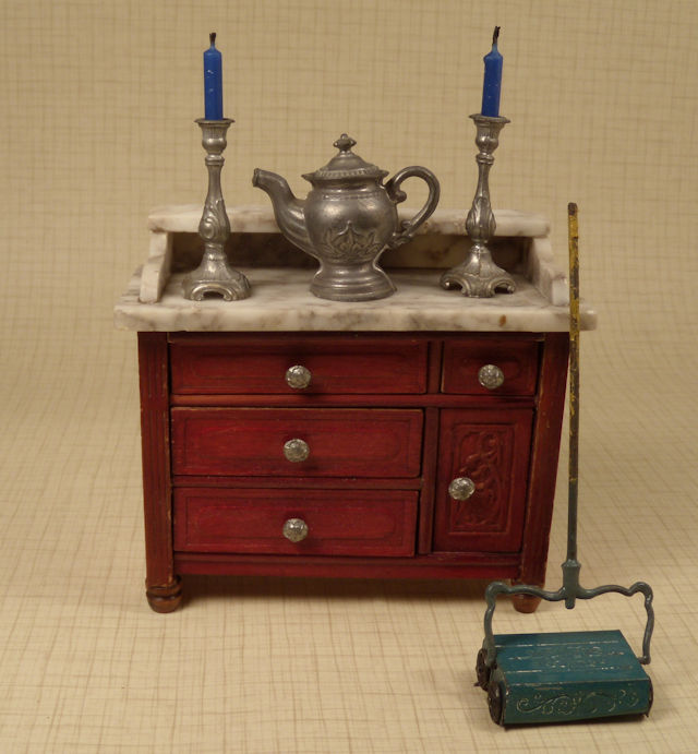 Beautifully made French early carpet sweeper, c. 1900. Base is a lovely blue color in tin with a lovely impressed design on top and the front and back. Has tiny wheels and a natural round brush just like a real carpet sweeper. Beautifully made and this particular piece is very difficult to find, especially in this lovely blue color. Handle is enameled yellow and has wear on the enameling. The rest is in lovely condition especially the blue enameled tin base portion. Overall height including the handle is 4 3/4". Made in France is impressed on the underside. Pictured with other dollhouse accessories, all sold separately.