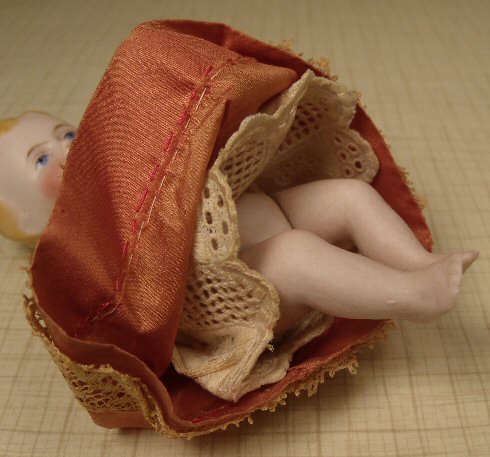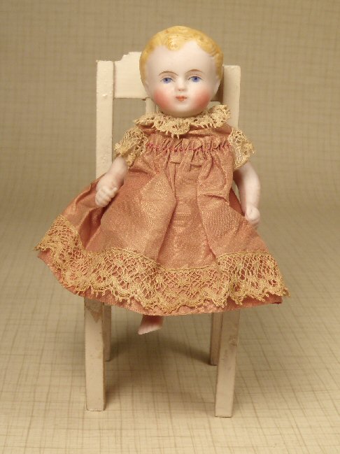 Fantastic and oh so rare all bisque toddler child by Simon & Halbig, made in Germany c. 1880, with the very rare feature of bent knees so that she can sit easily in a chair. Wonderful execution and very high quality, face is fantastic, beautiful modeling of head and body, the trademark of Simon & Halbig. Bare feet, one of the signs of an early all bisque doll. Both hands are molded in fits. Gorgeous face, I just can't say enough about this doll. Height is just a smidge under 4". Great very early peachy/rust silk dress trimmed with lace....I believe is original to her. Dress shows aging. Splendid early lace slip. This doll with her dress came from a family here in Massachusetts, passed down from one generation to the next. She is pictured in an early chair (chair is not for sale). Jointed at arms and legs. Great condition with no breaks, repairs or hairlines.