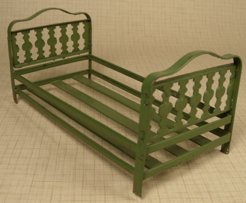 Lovely metal dollhouse bed enameled in a nice green color. Nicely executed headboard and footboard. 6 3/8" long; 3" wide. Possibly made in Germany. c. 1920. Nice condition with very minimal paint loss. This is 1" scale and ready for the dollhouse.