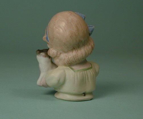 This darling little girl snuggling up to her cat is a pin cushion or half doll with 2 sew holes. She is exceedingly rare...very few half dolls were made with a child with her pet animal. She has her arms wrapped around him with her head tilted toward him very lovingly. This was made in Germany c. 1910 by the firm of Conte & Boehme. She has a blue head band with a large bow in her light brown hair with curls in the front framing her face. She has an open/closed mouth and her dress is yellow edged in green. Height is 2 1/2". Excellent condition with no breaks or repairs. No markings. Very rare item.