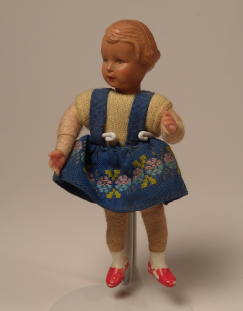 Darling little girl made by the firm of Caco in Germany after World War II. She has her original clothing consisting of a cream color short sleeve jersey shirt and blue skirt with machine embroidered flowers all the way around and matching straps, so evocative of the 1950's era. She has a darling little face with molded waves and curls in the back. She is 3" high and in very nice condition, a tiny bit of wear on her red painted shoes. The beauty of these Caco dolls is that they are bendable and posable, either standing, sitting or can be adjusted to many other poses. Here, she is shown sitting in a Warren Dick hand-made child size wing chair with a mother doll standing next to her. Mother and wing chair are sold separately.
