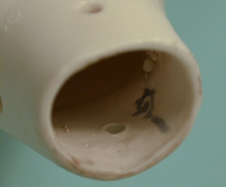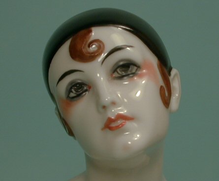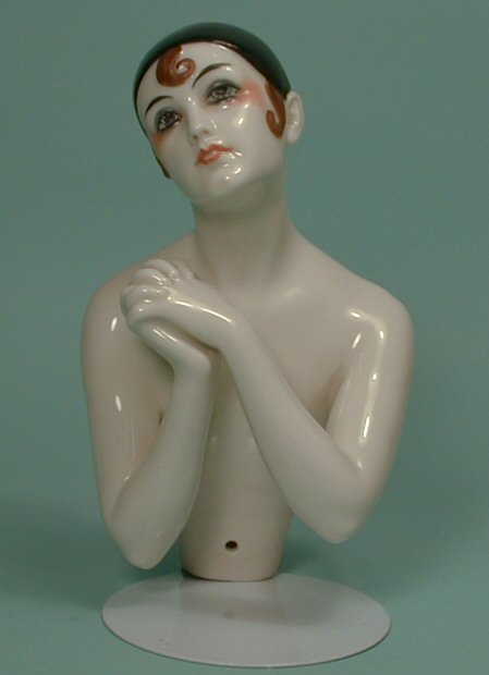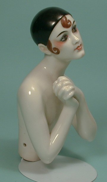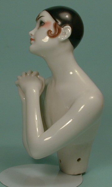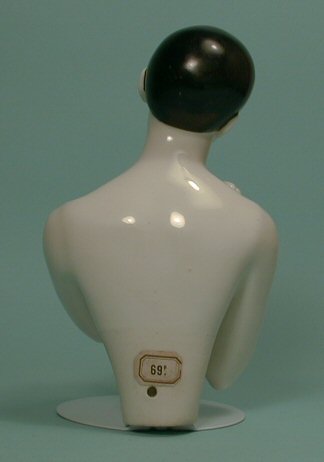 This Pierrette half doll by Dressel & Kister has to have one of the most fantastic faces I have ever had. She is the very large size, 6" high, with hands clasped and a dreamy look on her face....looks to be one of the first out of the mold as the facial features of this doll are exquisite. Beautiful intaglio eyes with very heavy eye make-up beautifully painted; delicately formed lips with a white space between; her chin and neck are exquisitely modeled with many contours.......I guess I cannot say enough about the loveliness of this doll......just superb. Her 3 brown spit curls are also modeled, meaning the hair protrudes from the face and not just painted. Fully marked with the Dressel & Kister mark on the inside, as shown, and she also has an original shop price label 69F (most likely Francs). Great condition with no breaks, repairs or hairlines. This is truly a choice half doll. Made in Germany c. 1915. I believe this is the largest size of Pierrette; pictured in the Encyclopedia of Half Dolls on pg. 48.