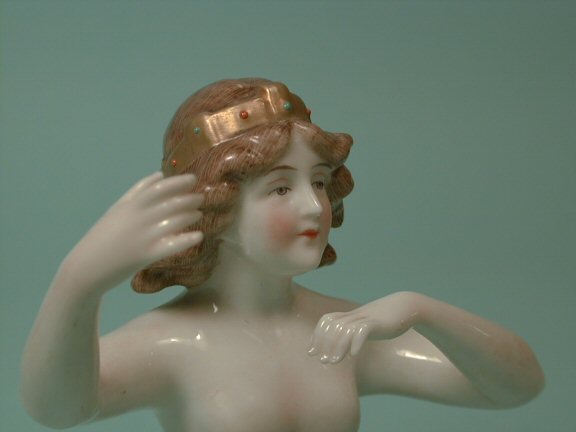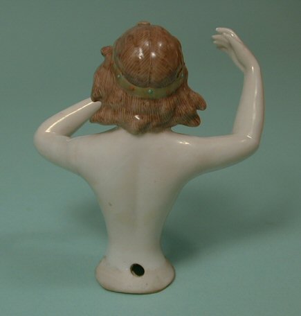 The lovely half doll pictured was produced by the Sitzendorf company in Germany c. 1910. Both arms are way up with the arm on the left side raised as high as her head--perhaps she is dancing. Her wonderful face is finely detailed and her flowing hair is as if the wind is blowing it from the front and flows out from her face--this is very unusual in a half doll. Her hair is light brown with extra lines painted in to denote hair strands. In her hair is a molded gold crown or band that has colorful jewels molded in. Her fingers are so delicate and nicely formed. This is truly a spectacular, very unusual half doll. She is marked on the back with the numbers 22675. This model is pictured in an original Sitzendorf catalog, listed under the same model number #22675. It is also pictured in the Encyclopedia of Half Dolls on page 218. Height is 3 1/2". She is in great condition with no breaks, repairs or hairlines.