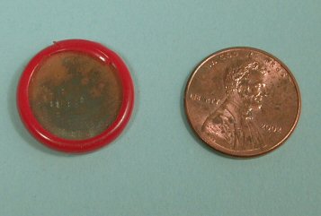 What a great accessory for the fashion conscience doll of the 1950's and for those who love the movie star collectibles of the 1950's. This is a tiny mirror to be held in the hand or placed in a doll's pocketbook; the back has a picture of 1950's movie star Susan Hayward. The frame is bright red plastic. 3/4" diameter and shown with a penny for size comparison. It is in very nice condition, with picture and red frame nice and bright, but the mirror has some silvering loss.