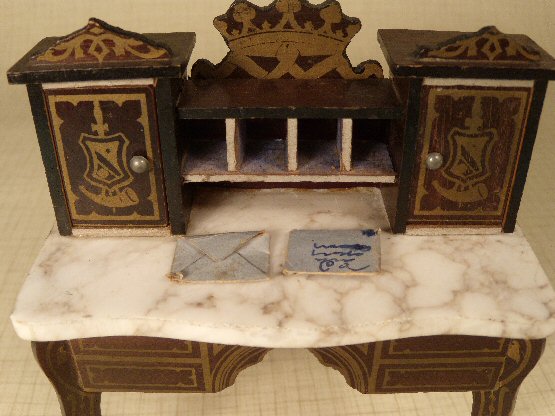 Beautifully made dollhouse boulle desk with the rare feature of a marble writing surface by the reknown German firm of J. D. Kestner. Beautiful dark finish with gold gilt accents, crown in the middle and shields on the two doors which open and other additional gold gilt decorations on skirt and legs. Cubbies in the center portion to hold paperwork. Comes with 2 original lovely blue envelopes, both of which are cut and decorated just like a real envelope, one of which has writing on the front and the other front is blank; envelopes are a scant 1/4" by 1/2". Made during the 2nd half of the 1800's. Height is 4 1/2" at highest point and 4" wide. Lovely condition, showing slight wear. Also pictured with a 6" tall dollhouse grandfather to show how nicely they look together;grandfather is sold separately.