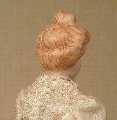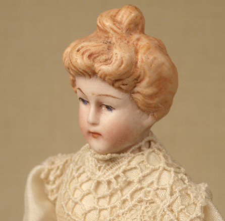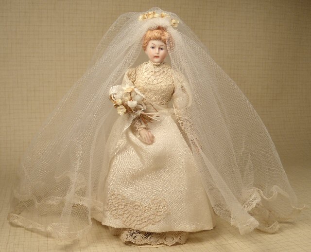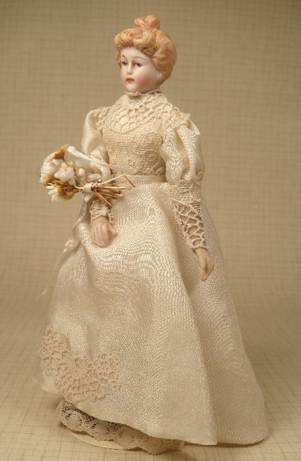 The dollhouse is having a wedding and here comes the bride coming down the staircase! Can't you just picture this dollhouse bride coming down the staircase of your dollhouse? Very lovely 6" tall bride made by the firm of C. F. Kling & Co. in Germany c. 1900. She has a gorgeous antique white silk gown trimmed with hand-made lace and with a very long double antique toule veil, so that one layer can be pulled forward covering her face or can be pushed back as pictured in the first photograph. She has a very unusual character face, as if she is thinking...do I really want to go through with this....or can I change my mind? Her molded dark blond hair is in a typical Victorian style, a top-knot at the top of her head with lots of curls and brush marks. Head, arms and legs are bisque with molded black heeled shoes. Lovely condition, with no breaks or repairs. There are numerous photos showing this lovely, hesitant bride. She is 6" high. Thanks to the research by Mary Krombholz, we now know the makers of these wonderful dollhouse dolls.