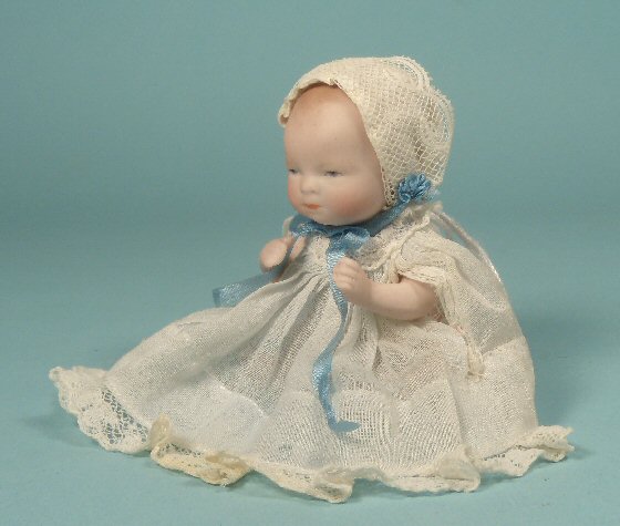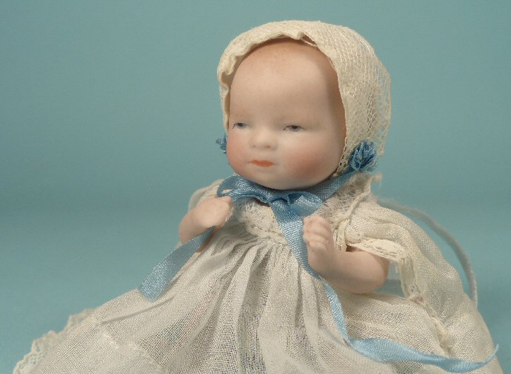What a sweet little all bisque Bye Lo baby made by the German firm of Kestner. She is 4" high and is jointed at the arms and legs. Her darling face is all hand painted and the execution of her features is wonderful. She is fully marked on her back, numbers and Copyright by Grace Putnam, and she has a partial paper label on her chest as shown in the photo. Her darling dress is very pale light blue which is accented by a darker blue ribbon and rosettes on her darling little off-white hat. Dress and hat also trimmed with early lace. Her hands are in the typical Kestner fashion, one hand up and somewhat open while the other hand is more turned inwards. Beautiful condition with no breaks or repairs. Clothing shows some aging but very beautiful. She also wears lacy undies. She can be posed sitting or laying down.